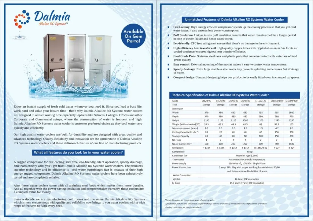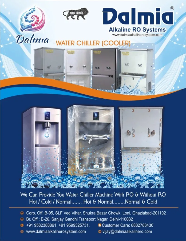 Dalmia Alkaline RO Systems manufactures heavy-duty stainless steel water chillers designed for continuous public and industrial use. These units are built using food-grade SS body and efficient refrigeration components to deliver chilled drinking water throughout the day without performance drop.